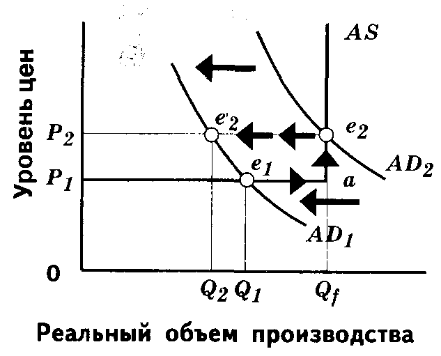 Анализ последствий уменьшения совокупного спроса показывает, что: 1) на кейнсианском отрезке реальный объем национального производства уменьшится, а уровень цен останется неизменным; 2) на классическом отрезке цены упадут, а реальный объем национального производства останется на уровне полной занятости; 3) на промежуточном отрезке и реальный объем национального производства, и уровень цен уменьшатся.