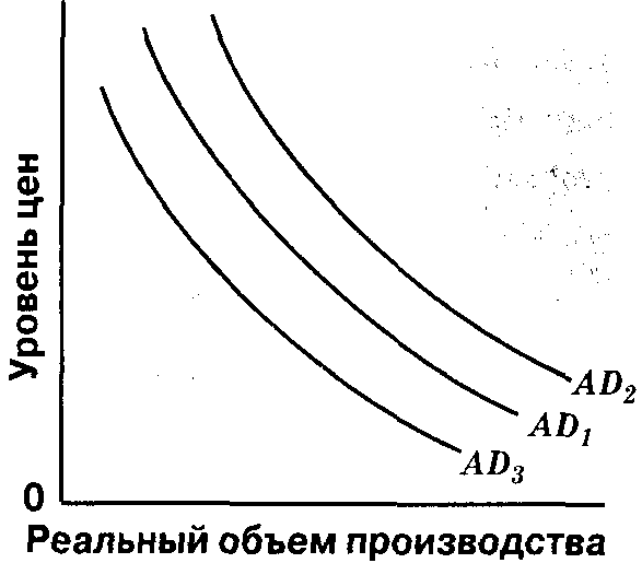 Рис. 2. Изменения совокупного спроса Изменение одного или нескольких неценовых факторов совокупного спроса приводит к изменению совокупного спроса. Увеличение совокупного спроса показано как смещение кривой AD вправо, от AD>1> к AD>2>, а уменьшение совокупного спроса как смещение от AD>1> к AD>3>.