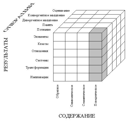 Факторно-аналитические исследования, которые более двадцати лет проводились Дж. Гилфордом и его сотрудниками в университете Южной Калифорнии с целью разработки тестовых программ измерения общих способностей, завершились созданием кубической модели структуры интеллекта. Эта модель позволяет выделить 120 факторов интеллекта, которые могут быть классифицированы в соответствии с тремя независимыми переменными, характеризующими процесс переработки информации. Эти переменные следующие: 1) содержание предъявляемой информации (характер стимульного материала); 2) операции по обработке информации (умственные действия); 3) результаты обработки информации.