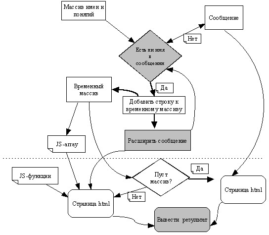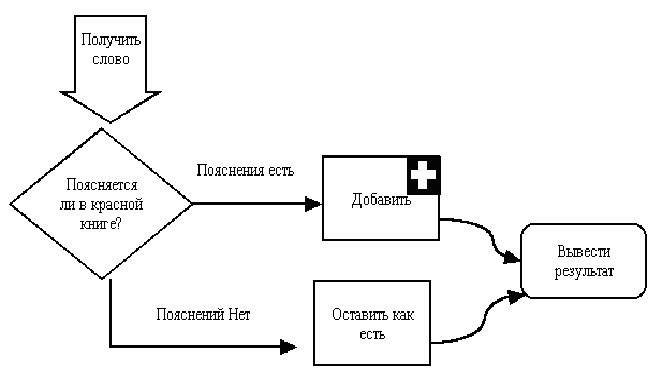 Одни и те же слова, одни и те же персонажи в разных базах данных будут иметь разное значение и разное описание. Так, история о выборе веры хазарским каганом в каждой из трех книг получает различное окончание. Особого внимания заслуживает вопрос о том, кто же должен расставлять все эти кресты, звезды и полумесяцы в книге, кто выполняет эти функции "отсылающего". Раньше такой агент обязательно должен был быть человеком. Теперь же при работе с электронными документами вполне можно доверить эту работу программному агенту. Этот агент будет просматривать текст книги, и сравнивать слова этого текста с содержимым своих баз данных, каждая из которых связана с другими книгами. Алгоритм работы агента по проверке того, встречается ли данное слово в списке имен и понятий красной книги, приводится на рисунке 1.