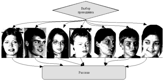 Сами тексты рассказов создавались командами школьников и представляли сочинения на тему: "Один день школьника в нижегородской деревне...".Обычный рассказ, в котором герои действуют на фоне деревенского пейзажа с его колодцами, дорогами, реками мостами, встречаются с учителями, старожилами, умельцами под воздействием программного агента мгновенно превращается в гипертекст, наполненный фотографиями, звуками, видеозаписями. Таким образом, в результате совместной деятельности сетевого сообщества учителей, учеников и программных агентов мы получили многомерный мир, сотканный из множества ссылок и воспоминаний. За счет действия программного агента эти учебные рассказы-сочинения расширяются и поясняются дополнительными рассказами, фотографиями, аудио- и видеозаписями. Поскольку в нашем распоряжении находится несколько вариантов записей, связывающих одно и то же слово с различными для различных деревень фотографиями, рассказами и аудиозаписями, то мы можем дополнить текст рассказа, созданный жителями другой деревни, записями, сделанными в другой деревне. Для этого достаточно лишь указать программному агенту, какие записи нужно использовать. Это не только интересная техническая возможность - мы довольно часто наблюдали, как школьники использовали для просмотра и расширения своих текстов цифровые записи, сделанные другими командами. Схема обращения к материалам цифровой коллекции, как к точке зрения другого человека, представлена на рисунке 5.