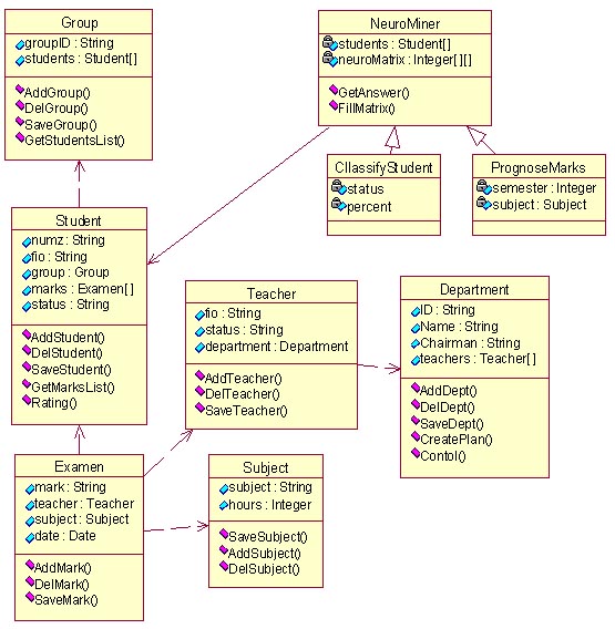 Базовой методологией при построении системы управления Университетом является объектно-ориентированная технология, позволяющая эффективно реализовать ее функциональные возможности. В качестве примера реализации на рисунке 2 приведен фрагмент диаграммы классов для варианта использования "Студенты и успеваемость".