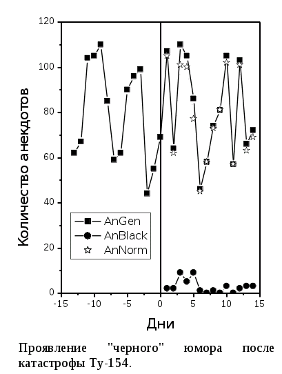 Вместе с тем определенное количество анекдотов, посвященных критическому событию, продолжают присылать даже спустя один-два года. Так, в конце двухнедельного периода наблюдений после крушения Ту-154 большая часть черного юмора была связана с украинскими ПВО (аналогичная катастрофа годом ранее) и Бен Ладеном (терактам 11.09.01 предшествовал угон самолетов). И это уже говорит о том, что для некоторых людей возможностей черного юмора по борьбе со стрессом недостаточно, у них формируются невротические комплексы, требующие помощи профессионалов. Но таких людей – считанные проценты среди посетителей и авторов сайта. И это внушает нам оптимизм. Не менее оптимистично мы оцениваем малый период рефрактерности, время юмористической реакции на критическое событие: на рисунке «Ту-154» хорошо видно, что пик черного юмора приходится на 3-5 день после катастрофы (на рисунке «11.09» - на второй день). Таким образом, можно сказать, что юмористическая реакция опережает создание мифа ненависти и разрушения.