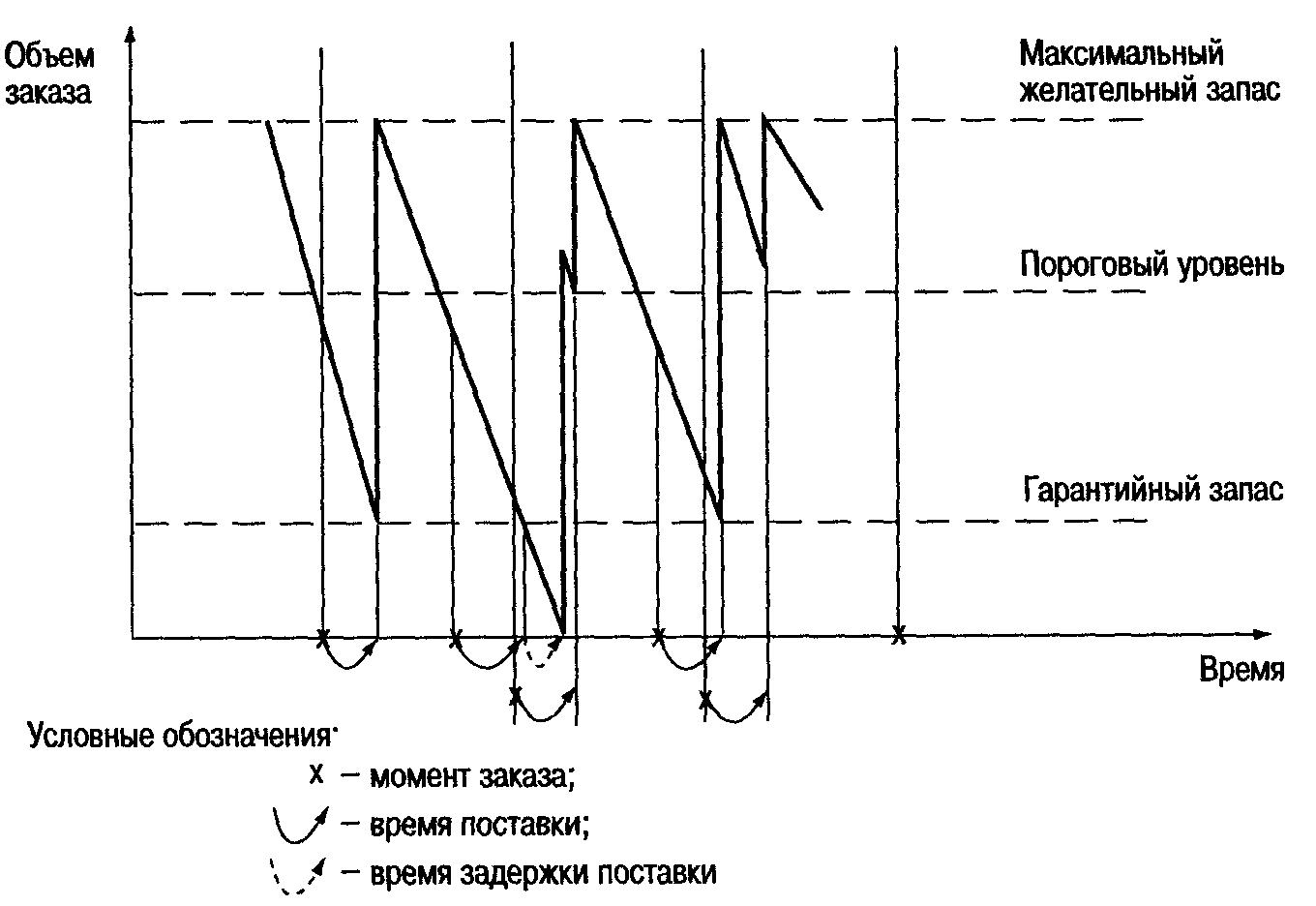 Пороговый уровень запаса используется для определения момента времени выдачи очередного заказа.