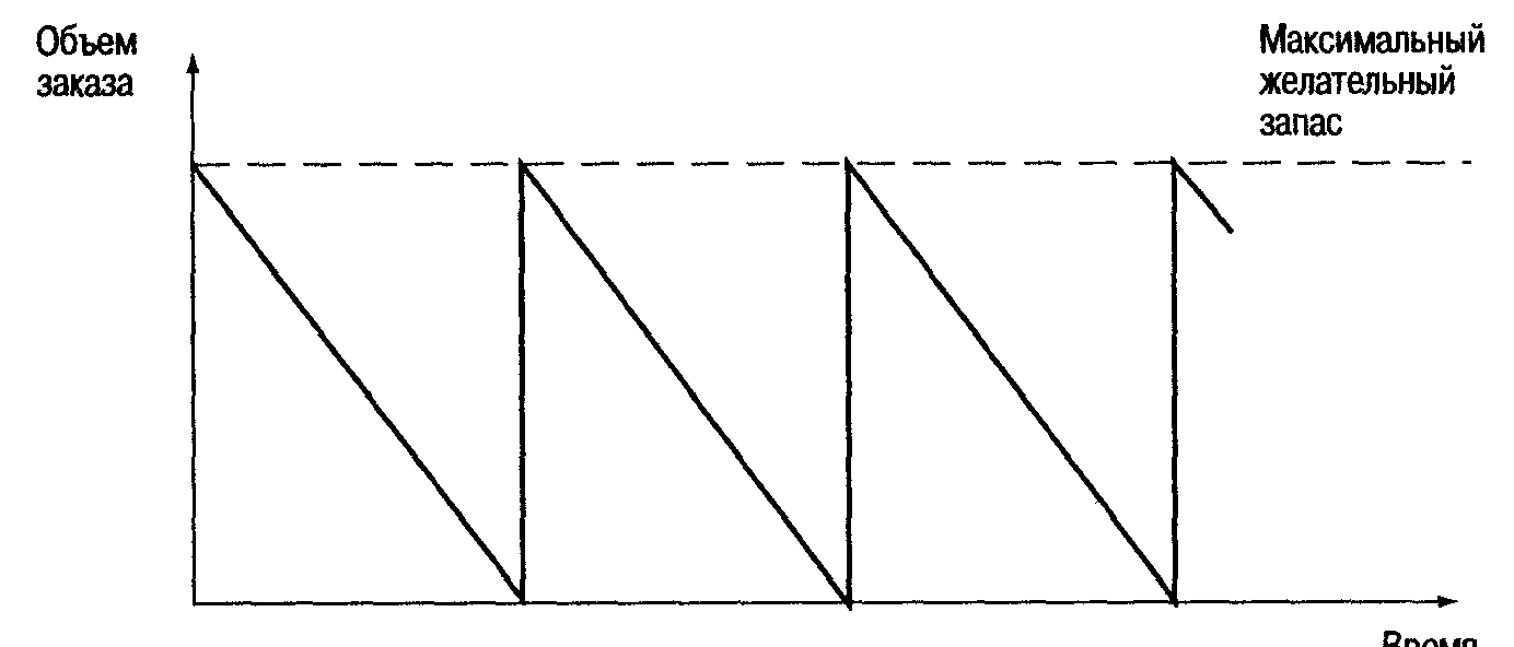 Размер заказа рассчитывается таким образом, что при условии точного соответствия фактического потребления (до момента поставки) прогнозируемому поставка пополняет запас на складе до максимального желательного уровня.