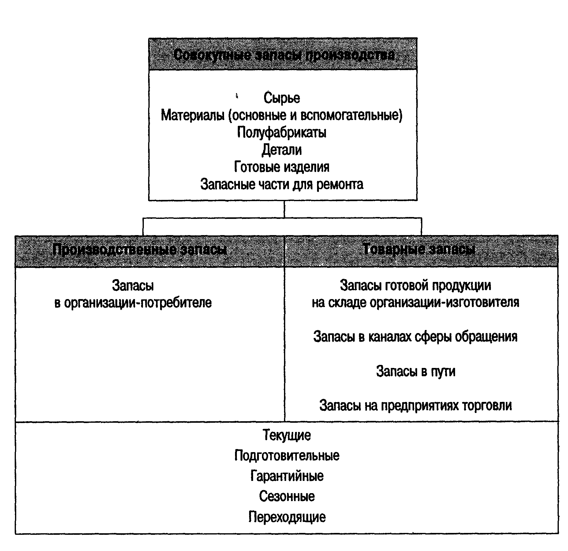 Один из ее вариантов приведен на рис. 2. Все запасы, имеющиеся в экономике, определены как совокупные. Они включают в себя сырье, материалы (основные и вспомогательные), полуфабрикаты, детали, готовые изделия, а также запасные части для ремонта средств производства. Основная часть совокупных запасов производства - предметы производства, входящие в материальный поток на различных стадиях его технологической переработки.