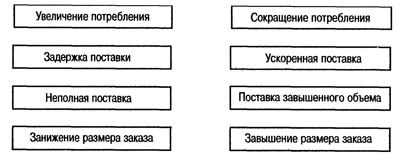Довольно часто имеют место многообразные сочетания возмущающих воздействий, отклоняющих систему управления запасами от нормального функционирования. На рис. 8 в левом столбце приведены возмущающие воздействия, приводящие систему в состояние дефицита материальных запасов. В правом столбце - возмущающие воздействия, приводящие к возможному дефициту складских площадей (если такой возможен). Правый и левый столбцы отражают гипотетическую ситуацию крайне неблагоприятного суммарного воздействия на систему Более вероятно разнообразное сочетание воздействий, перечисленных в правом и левом столбцах. Эта вероятность зависит от конкретных условий функционирования системы управления запасами