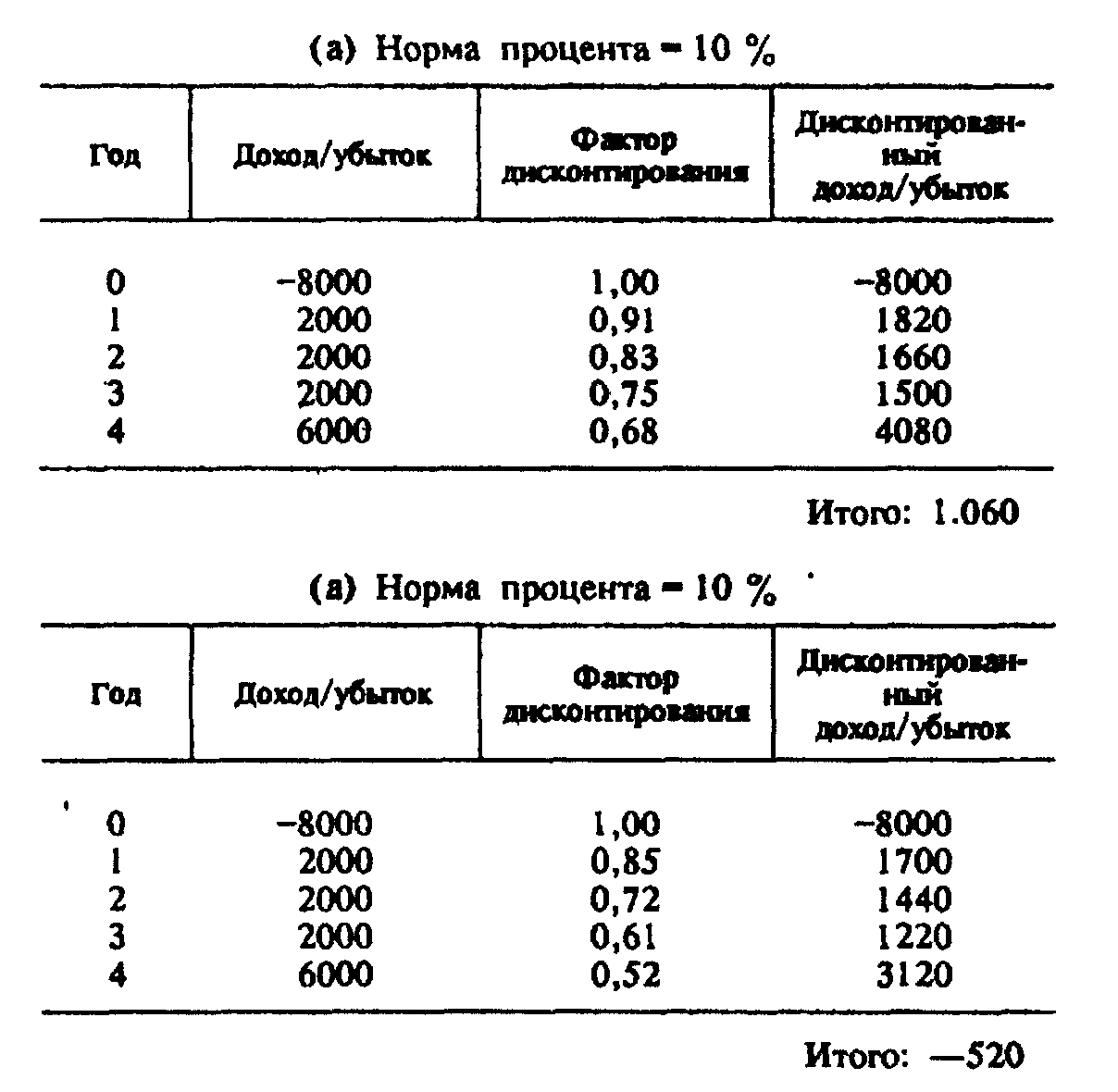Как становится очевидным после рассмотрения табл., при норме процента, равной 10% годовых, эта инвестиция представляется выгодным мероприятием; при норме процента, равной 18% годовых, это вложение капитала будет убыточным и для фирмы.