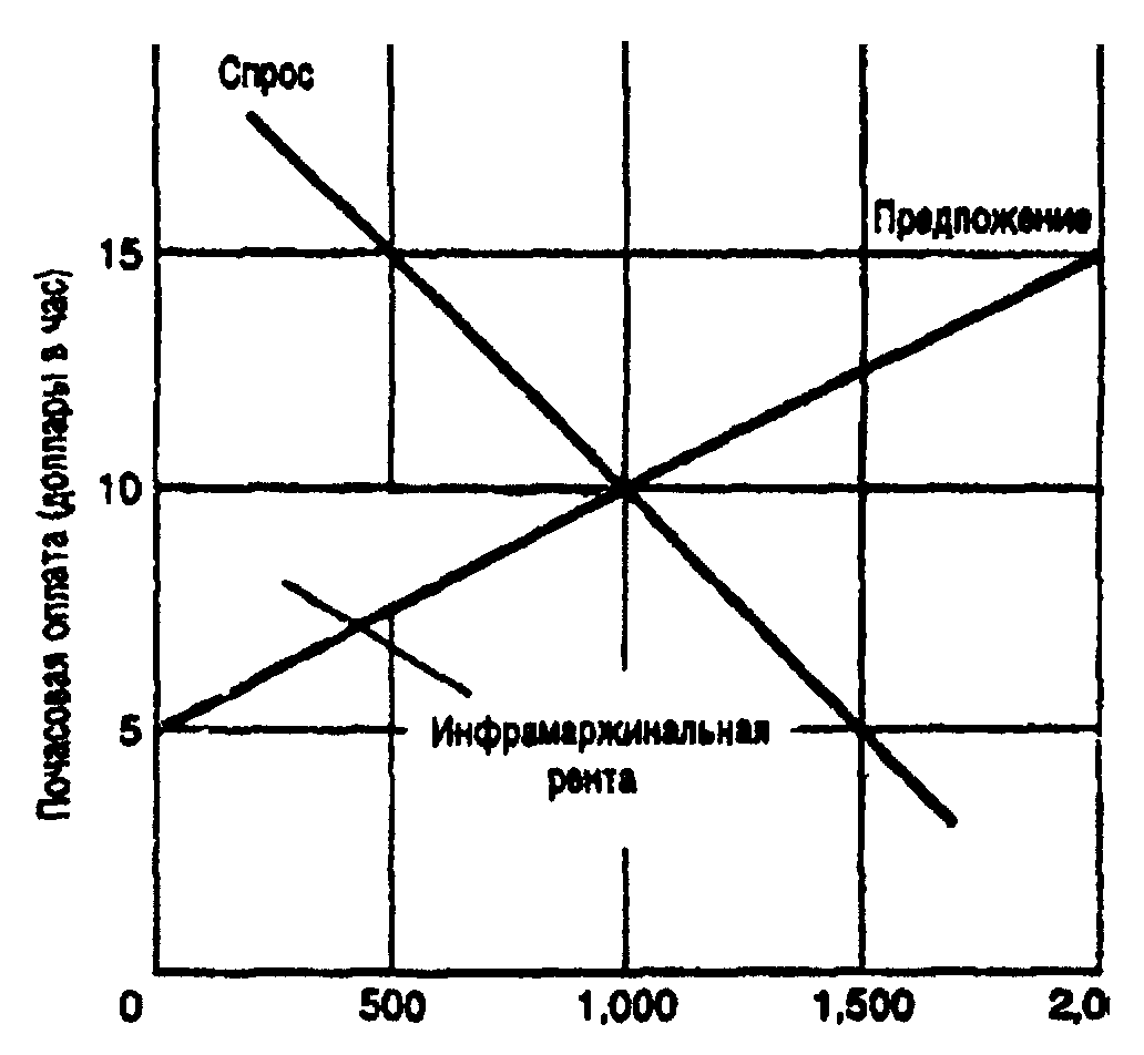 На некоторых рынках, где единицы привлекаемых ресурсов одинаковы по производительности, но различны по степени активности их предложения, возможно ввести такую экономическую категорию, как инфрамаржинальная рента. На рисунке показана ситуация спроса и предложения на услуги сиделок. Начальное предложение рабочей силы на этом рынке формируется при уровне заработной платы 5 долларов в час; привлечение большего количества занятых требует увеличения почасовой оплаты. При равновесной норме почасовой оплаты, составляющей 10 долларов, лишь некоторые получают эту ставку. Остальные получают инфрамаржинальную ренту, которая определяется разностью между равновесной нормой зарплаты и тем минимумом заработка, на который они согласились прежде, чем искать альтернативные источники существования.