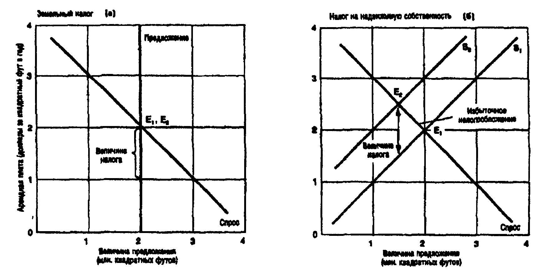 Он рассуждал следующим образом: если земля облагается налогом, сопряженным с величиной земельного угодья, а предложение земли на рынке совершенно неэластично, то собственники и латифундисты не смогут переложить экономическое бремя земельного налога на плечи своих арендаторов, а будут вынуждены сами нести эту повинность. Более того, если не станет происходить незапланированное изъятие земельных угодий из сферы действия рынка, то существование избыточного налогообложения само по себе ставится под сомнение. На рис. приводится сопоставление двух различных форм налогообложения: