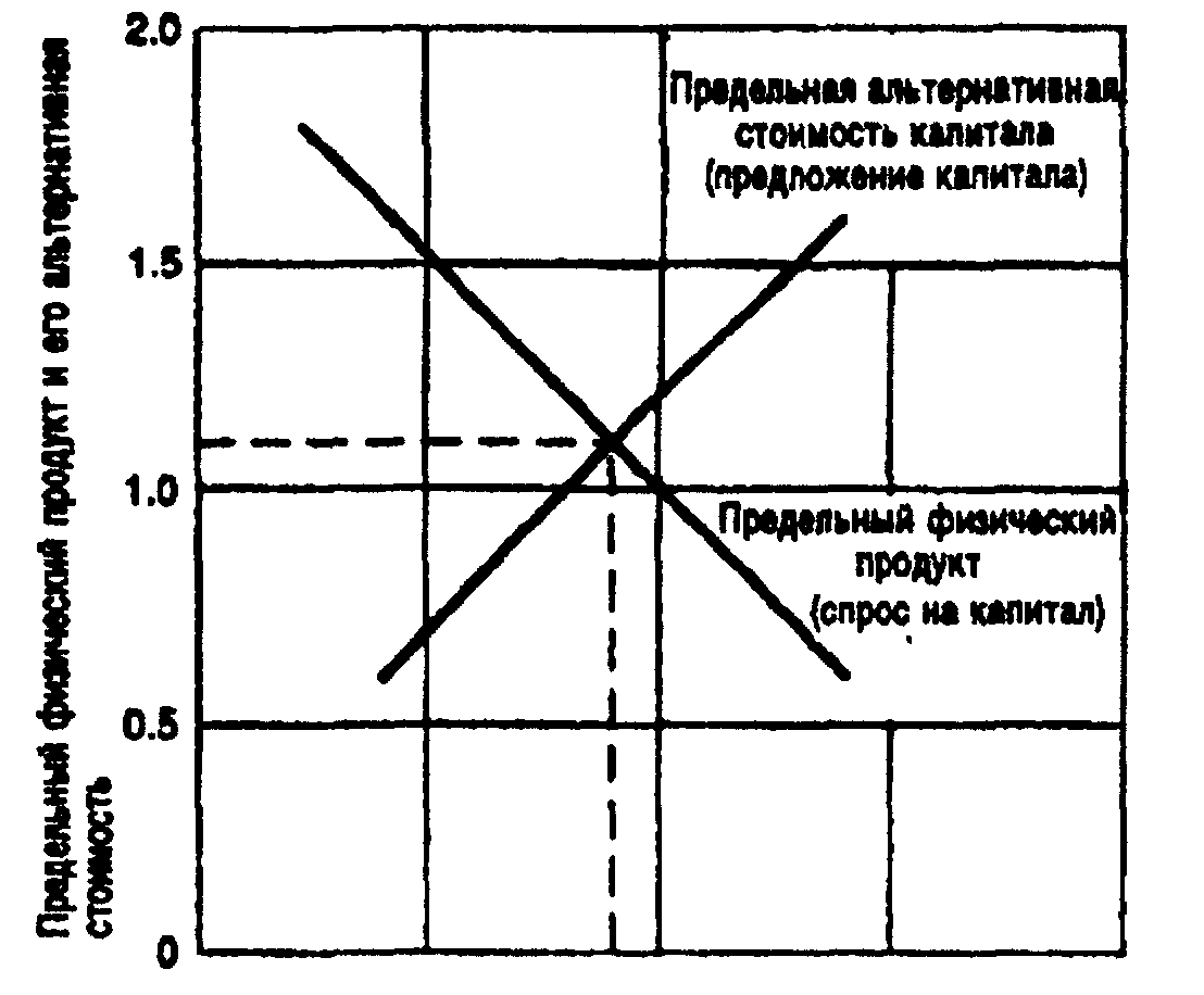 Рис. Предельный физический продукт и альтернативная стоимость капитала. На диаграмме, представленной на рисунке, даны графики функций предельного физического продукта (спроса на капитал) и предельной альтернативной стоимости (предложения капитала) для двухпараметрической модели. По оси абсцисс отложен объем инвестирующего капитала, по оси ординат — предельный физический продукт и альтернативная стоимость вложения капитала, выраженные в относительных единицах. Закон убывающей доходности определяет отрицательный наклон графика функции предельного физического продукта (спроса на капитал); наоборот, график функций альтернативной стоимости капитала (предложения капитала) имеет положительный наклон. В точке пересечения этих графиков (в точке равновесия экономической системы) предельный прирост объема продукции, которая будет произведена в будущем, нивелирует временные предпочтения хозяйственных агентов, то есть тенденцию увеличения полезности товаров и услуг, потребляемых сегодня.