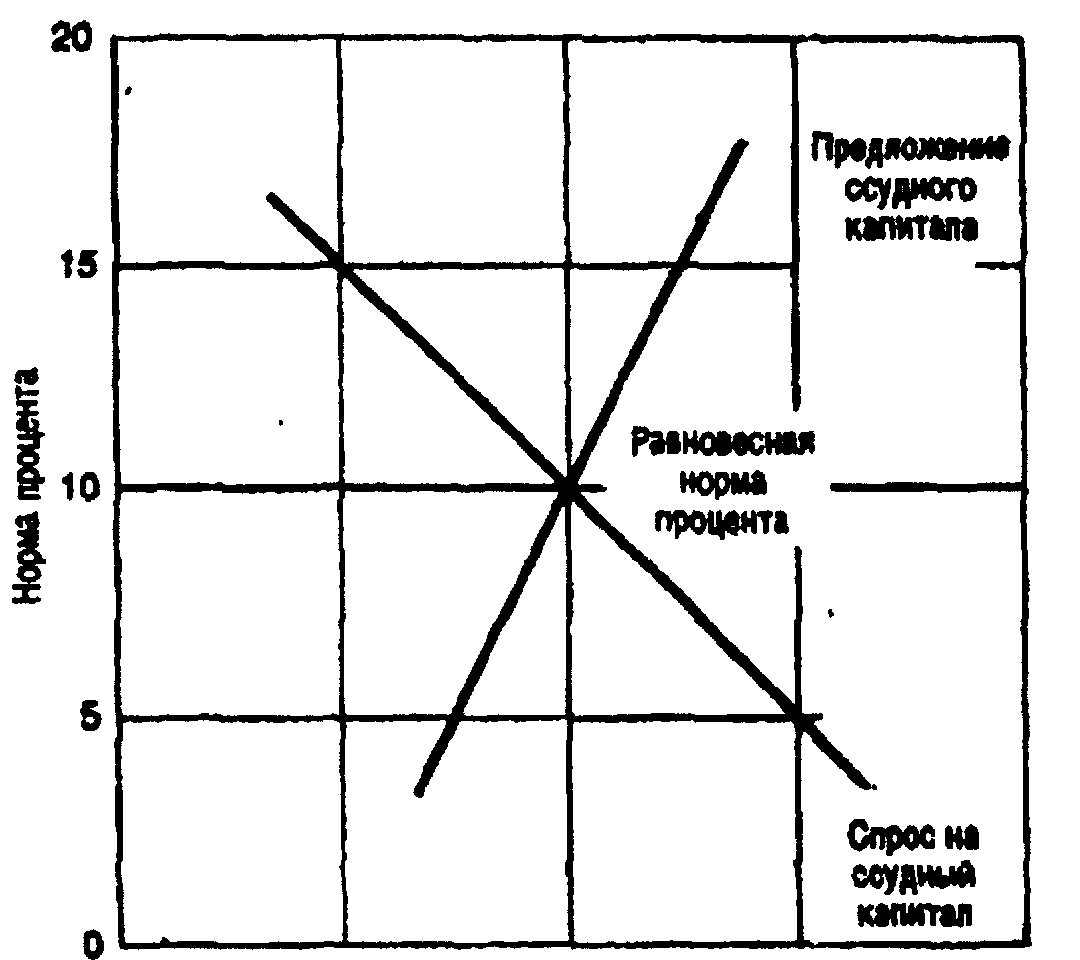 Все без исключения агенты и индивиды, получающие и предоставляющие ссуды и займы (по любым причинам), являются действующими лицами на рынке ссудного капитала. Кривая спроса на ссудный капитал показывает, что при прочих равных условиях хозяйственные агенты будут чаще прибегать к услугам рынка ссудного капитала, направляя полученные средства как на инвестиции, так и на потребление, по мере снижения нормы процента. Характер кривой предложения отражает тот факт, что увеличение нормы процента способствует при прочих равных условиях росту предложения средств на этом рынке. Равновесная норма процента определяется пересечением кривых спроса и предложения.
