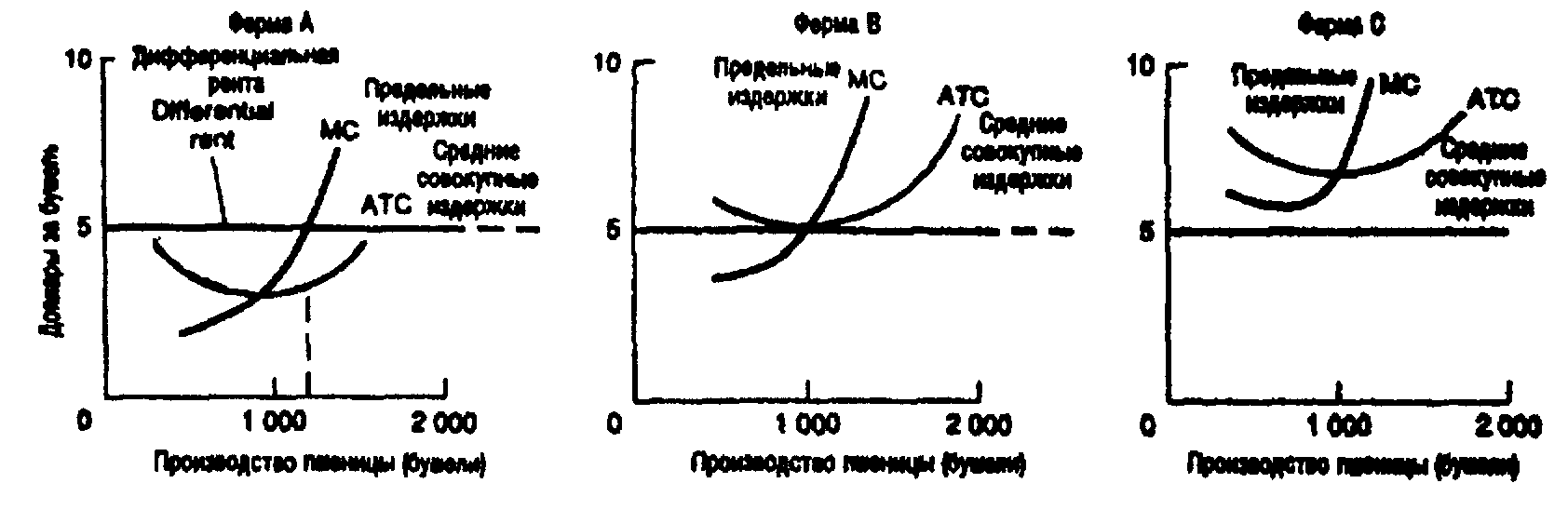 Теоретические предпосылки анализа такой экономической категории, как чистая экономическая рента, базируются на признании равноценности любых земельных угодий одинаковой площади. На практике различные участки земли обнаруживают разную степень продуктивности при вариации их использования. Это существенным образом сказывается на соответствующей ренте. На диаграмме представлены графики функций предельных и средних совокупных издержек для трех фермерских хозяйств А, В и С, возделывающих пшеницу на отличающихся лишь плодородностью земли участках. При рыночной цене на пшеницу в 5 долларов за бушель ферма А получает дифференциальную ренту в 2 доллара за бушель. Величина ренты обусловлена разностью между издержками производства пшеницы на ее плодородном участке и ставками арендных платежей на рынке земельных угодий. При такой цене на пшеницу ферма В только-только покрывает свои издержки, не получая никакой выгоды в виде ренты, а ферма С вообще не появляется на рынке пшеницы. Заметим, что увеличение рыночных цен на пшеницу кардинальным образом меняет ситуацию. Например, при увеличении цены пшеницы до 7 долларов за бушель ферма А увеличивает свой доход в виде дифференциальной ренты, ферма В начинает получать его, а ферма С появляется на рынке пшеницы.