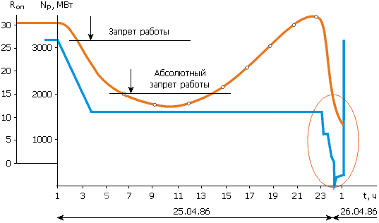 Рис. 1. Мощность (N>p>) и оперативный запас реактивности (R>оп>) реактора 4-го блока на отрезке времени от 25.04.1986 до официального момента аварии 26.04.1986 [12] (овалом выделен предаварийный и аварийный отрезки времени)
