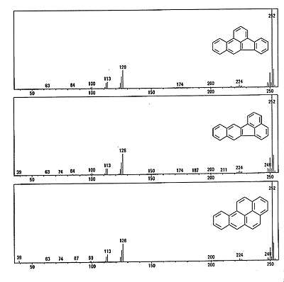 Масс-спектры ПАУ с данной массой молекулы мало характеристичны. На рис. 1 [1], представлены масс-спектры трех соединений с массой молекулы 252: бензо/б/флуорантена, бензо/к/флуорантена, а также бензо/а/пирена. Спектры практически идентичны несмотря на то, что соединения принципиально отличаются строением. Идентификация отдельных ПАУ в технике ГХ-МС требует соответствия масс-спектра и времени выхода. Попытка однозначной идентификации соединений, опирающаяся только на масс-спектры, может оказаться ошибочной. В то же время оптические спектры поглощения представленных соединений имеют существенные различия. По-видимому "незначительная" разница в расположении одного кольца наблюдаемая между бензо/б/флуорантеном и бензо/к/флуорантеном сильно влияет на вид спектра поглощения (рис. 2 [1]).