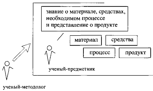 Предположим, что наш ученый-предметник осуществил все эти процессы и построил определенные процессы и знания. Но затем, чтобы выделить и формализовать средства, которыми он пользовался, он должен как бы "выйти" из плоскости доски и поглядеть на себя и свою деятельность со стороны. В этом случае он переходит в принципиально новую позицию: перестает быть специалистом-предметником и становится методологом. И его знание о своей собственной деятельности становится методологическим для него и других, в отличие от методических знаний.