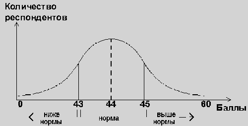 Распределение результатов, полученных при тестировании испытуемых выборки стандартизации, можно изобразить с помощью графика – кривой нормального распределения. Этот график показывает, какие значения первичных показателей входят в зону средних значений (в зону нормы), а какие выше и ниже нормы. Например, на рис.1 изображена кривая нормального распределения для теста "Прогрессивные матрицы Равена".