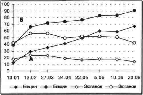 Что же касается Г. Зюганова, то у него подобного ресурса просто не было, практически на всем протяжении избирательной кампании доля доверяющих ему равнялась доле собирающихся за него голосовать (около 20%), лишь на последнем этапе (во втором туре) она несколько выросла за счет противников Б. Ельцина из других электоратов.