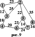 Попробуем решить данным алгоритмом ЗК для восьми городов. Пусть имеем восемь городов, расположение которых показано на рис. 11. Матрица расстояний приведена рядом на табл. 13. Промежуточные построения кратчайшего тура показаны пунктирными линиями, цифры – порядок удаления рёбер. Таким образом, имеем для данного случая кратчайший тур 1-3-7-5-4-8-6-2-1. Длина этого тура: D=6+7+5+2+6+5+13+13=57. Этот результат является правильным, т. к. алгоритм лексического перебора, который никогда не ошибается, даёт точно такой же тур. (Следует также отметить, что жадный алгоритм для этого случая ошибается всего на 1 и даёт тур 1-3-4-5-7-8-6-2-1 длиной в 58).