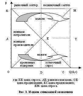 Для удовлетворения неплатежеспособной части социально-значимых потребностей государство организует нерыночную («квазирыночную») сферу производства. Как видно из рис. 1 нерыночный сектор смешанной экономики существует за счет рыночного сектора и не может превышать размеров его «консолидированного излишка» (т.е. суммы «излишка потребителя» и «излишка производителя»).