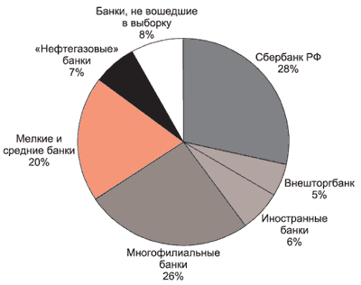 Банки, которые и раньше позиционировались в качестве активных чистых кредиторов реального сектора (Сбербанк, многофилиальные банки, мелкие и средние банки), продемонстрировали меньшие темпы роста. Суммарный объем кредитов по этим группам увеличился за полгода на 23,6%, что заметно ниже показателей Внешторгбанка и иностранных банков (83,6% и 27,4% соответственно). Но в силу высокого удельного веса на кредитном рынке вклад этих групп в увеличение совокупного объема банковских кредитов оказался весьма значительным. На них пришлось 76% от общего прироста кредитов и 64% от прироста чистого кредита по банковской системе в целом (соответственно, 135 и 195 млрд. руб.).