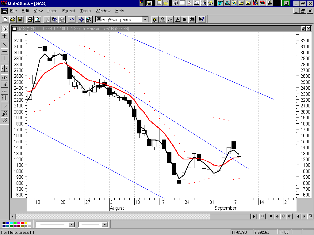ример дневного графика акций «Газпром» построенный в японских свечках.(график составлен с использованием программы MetaStock)