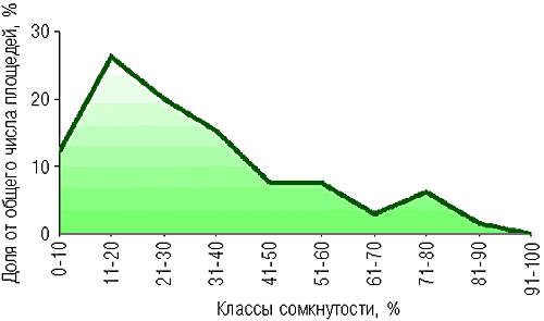 Рис. 13. Распределение регулярно расположенных круговых пробных площадей 5-метрового радиуса по классам сомкнутости древесного яруса (заповедник “Басеги”, западный макросклон Уральских гор, Пермская область) и модели строения древостоя: а) в естественном елово-пихтовом лесу с равновесным характером оконной динамики древостоя; б) в березово-еловом вторичном лесу на вырубкие 64-летнего возраста. Естественный елово-пихтовый лес, минимально нарушенный хозяйственной деятельностью человека, характеризуется преобладанием участков с низкой и средней сомкнутостью древостоя, хорошо выявляемых при данном размере пробных площадей. Условно-одновозрастный вторичный древостой, напротив, характеризуется высокой средней сомкнутостью и выровненностью структуры древостоя. |
