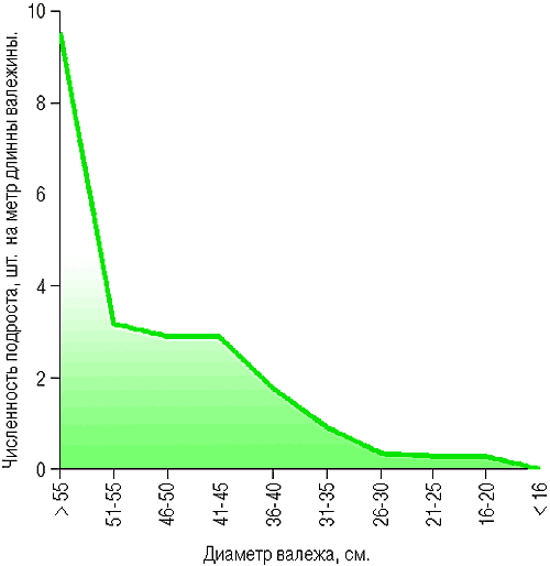 Рис. 15. Зависимость количества жизнеспособного подроста ели (более 10 см по высоте) от диаметра валежины под пологом естественного елово-пихтового леса, минимально нарушенного хозяйственной деятельностью человека. Заповедник Басеги, западный макросклон Уральских гор, Пермская область. |
