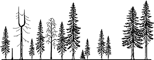Оконная или вывальная динамика - основной естественный механизм самоподдержания таежных лесов, развивающихся в течение жизни многих поколений деревьев без катастрофических внешних воздействий. В условиях Европейской России она характерна для темнохвойных лесов - еловых и елово-пихтовых, иногда с примесью кедра и обычно с примесью мелколиственных пород. Оконная динамика связана с гибелью отдельных старых деревьев и образованием на их месте просветов в древесном ярусе ("окон"), обеспечивающих доступ света под полог древостоя и дающих возможность молодым деревьям развиться и занять место в верхнем ярусе древостоя (рис. 11). При равновесном характере оконной динамики гибель старых деревьев происходит более или менее равномерно по всей площади леса и по времени. За счет этого образуется абсолютно разновозрастный древостой, в котором присутствуют деревья всех возрастных групп, а возрастной спектр древесных пород соответствует возрастному спектру устойчивой популяции, с преобладанием по количеству особей более молодых возрастов и постепенным снижением количества особей старших возрастов (рис. 12). Леса с равновесным характером оконной динамики характеризуются наибольшей устойчивостью во времени. Характерной чертой таких лесов в условиях европейской тайги является относительно низкая сомкнутость и обилие "окон" в древесном ярусе (рис. 13). Однако, равновесный характер оконной динамики в условиях таежных лесов Европейской России встречается крайне редко. Значительно более обычны леса, в которых оконная динамика только формируется (при распаде древостоев, выровненных по структуре благодаря какому-либо старому нарушению, обычно пожару) и еще не имеет равновесного характера. Такие леса обычно не являются абсолютно разновозрастными и характеризуются преобладанием того или иного поколения деревьев. Древостой в таких лесах обычно более или менее выровнен по сомкнутости, а образующиеся окна часто имеют довольно большие размеры за счет единовременного вываливания больших групп сходных по возрасту деревьев.