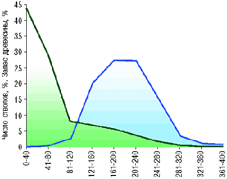 Рис. 12. Распределение количества экземпляров ели (зеленая линия) и объема их древесины (синяя линия) по возрастным поколениям в естественном ельнике чернично-долгомошном (без учета всходов). Республика Коми (по Дыренкову С.А., 1966). |
