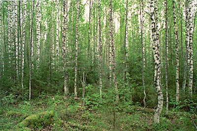 Рис. 20. Молодой березовый лес, сформировавшийся на месте вырубки, произведенной более 30 лет назад. Архангельская обл. Фото А. Ярошенко. |