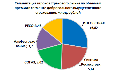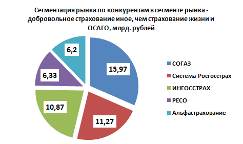 На приоритетном для большинства страховщиков сегменте рынка - добровольное страхование иное, чем страхование жизни и ОСАГО, конкурентами являются страховые компании: СОГАЗ, Росгосстрах, РЕСО-Гарантия, Альфастрахование. Сегментация на Диаграмме 4: