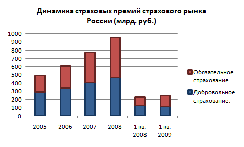 Основной тенденцией на страховом рынке России с учетом ОМС – Обязательного Медицинского Страхования являлось неуклонное увеличение объемов премий со среднегодовым темпом прироста 13,5%. Однако с началом экономическим кризисом, отрицательный эффект от которого проявился именно в 1 квартале 2009 года, наметилось значительное сокращение темпов роста рынка. За пять лет сборы премии по страхованию жизни упали в шесть раз, что вызвано очищением страхования жизни от налогосберегающих схем. Опираясь на результаты маркетинговых исследований и мнения экспертов страхового рынка, агентство ТОП-ЭКСПЕРТ сообщает следующее: По итогам 1 квартала 2009 года страхование жизни оказалось наименее затронуто кризисом и показало наибольший прирост среди всех видов страхования (остальные виды, кроме добровольного страхования ответственности и ОМС, продемонстрировали отрицательную динамику). При этом снижается доля кэптивных страховщиков за счет сокращения сотрудников организаций-страхователей, а также краткосрочного страхования жизни заемщиков за счет сжатия кредитования. Долгосрочное страхование жизни пока демонстрирует рост сборов премии. Положительную динамику имели и объемы страховых выплат во всех видах страхования. За прошедшие пять лет сохранилась тенденция по сокращению числа участников страхового рынка России. Государственный реестр на 01.04.09 содержит сведения о 769 страховых компаниях, за первый квартал отозвано 17 лицензий, из них четыре страховщика занимались ОСАГО, - их премии в данном виде составили 1,5 млрд. рублей. Ввиду высокой убыточности сегмента ОСАГО можно ожидать ухода компаний, ориентированных на развитие данного вида, особенно со значительной долей бизнеса в регионах. Также с рынка будут уходить региональные страховщики, имеющие проблемы с ликвидностью активов, высокой убыточностью и особенно, уровня расходов. Также возможен уход ряда компаний из первой сотни страховщиков, поскольку активно собирая страховые премии, страховщики дабы подержать платежеспособность компании, зачастую предлагают ставки, существенно ниже рыночных и ставок прошлого 2008 года, что вероятно является демпингом. В результате в кризисный период количество игроков неизбежно существенно сократится, - так предполагают эксперты компании Ингосстрах. Согласно данным ФССН (Федеральной службы страхового надзора), российские страховщики за первый квартал 2009 года увеличили сбор премий, включая ОМС, по сравнению с аналогичным периодом 2008 года на 6,0% до 243,2 млрд. рублей, выплаты выросли на 28,8% до 163,9 млрд. рублей.