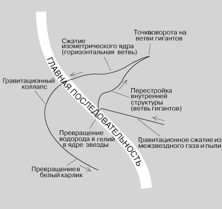 Скорость и картина эволюции звезды почти полностью определяются ее массой; некоторое влияние оказывает и химический состав. Звезда может быть физически молодой, но уже эволюционно состарившейся в таком же смысле, как месячный мышонок старше годовалого слоненка. Дело в том, что интенсивность выделения энергии (светимость) звезд очень быстро возрастает с ростом их массы. Поэтому более массивные звезды гораздо быстрее сжигают свое горючее, чем маломассивные.