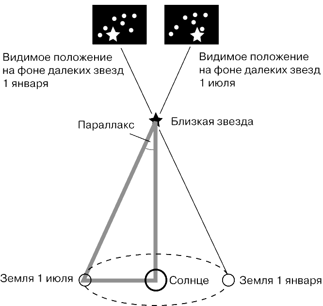 Параллакс. Метод параллакса основан на измерении видимого смещения близких звезд на фоне более далеких при наблюдении из разных точек орбиты Земли. Чем ближе звезда, тем больше ее угловое смещение. Параллаксом звезды называют угол, под которым от нее виден радиус земной орбиты, равный 1 астрономической единице (а.е.), или 150 млн. км. Это чисто геометрический и поэтому очень надежный метод. К сожалению, параллаксы удается измерить лишь у нескольких тысяч ближайших звезд. Расстояния до них служат фундаментом при определении спектральными методами расстояний до более далеких звезд.