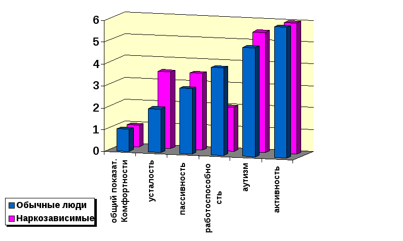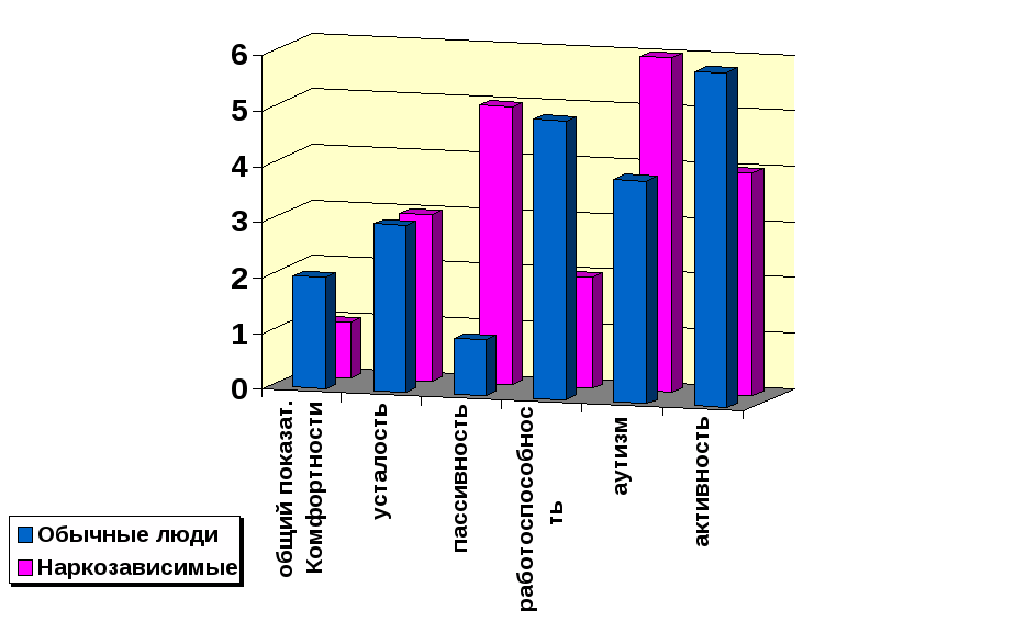 В картине мира у наркозависимых лиц, по сравнению с обычными людьми, изменяются такие показатели жизнедеятельности как: активность, аутизм, интерес.