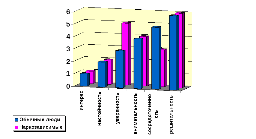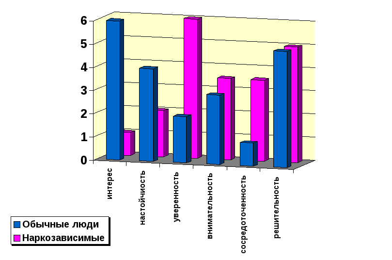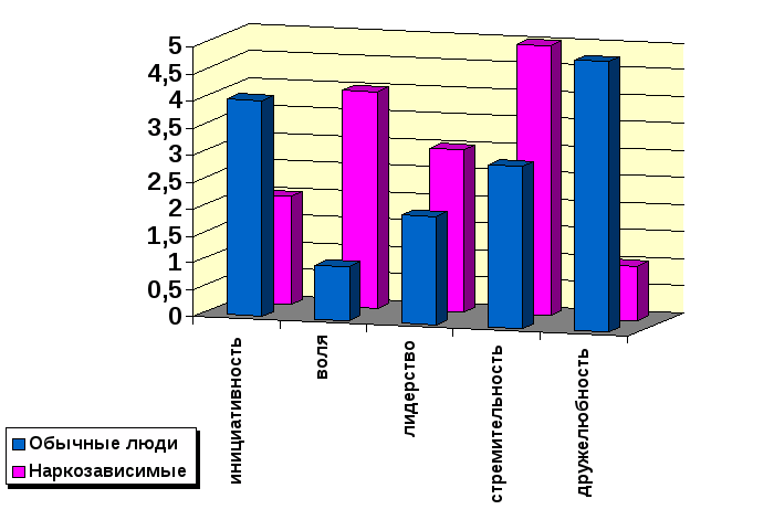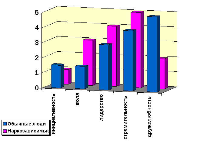 В картине мира у наркозависимых лиц, по сравнению с обычными людьми, изменяются такие личностные характеристики как: дружелюбность, стремительность, инициативность, лидерство, волевой компонент.
