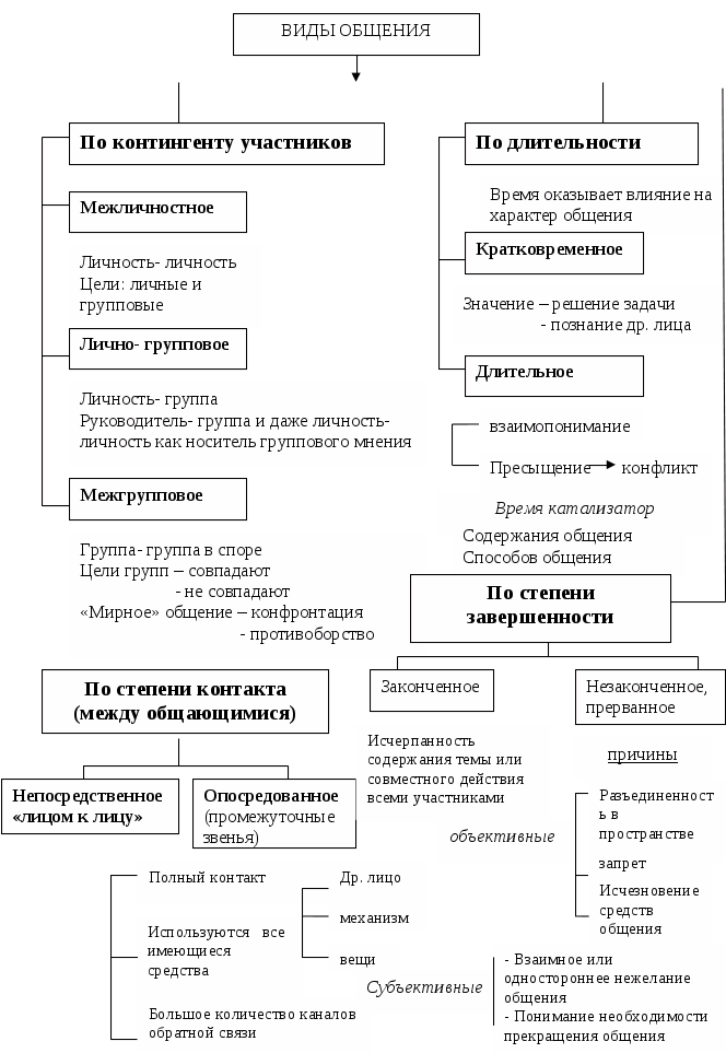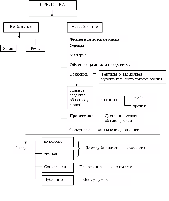 Общение, будучи сложным социально- психологическим процессом взаимопонимания между людьми, осуществляется по следующим основным каналам: вербальный (речевой)- от латинского слова устный, словесный, невербальный (неречевой) и документальный. Речь, как средство общения, одновременно выступает и как источник информации, и как способ воздействия на собеседника. Не следует забывать слова древнего поэта Саади: «Умен ты или глуп, велик ты или мал, не знаем мы, пока ты слова не сказал». Средства общения представлены в приложении А, в приложении Б представлена классификация видов общения.