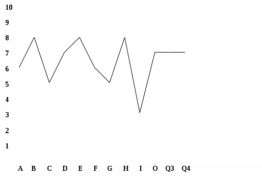 смелость, непринужденность и решительность. Самый низкий пик профиля – по шкале I – говорит о реалистичности, практичности, склонности во всем полагаться на себя, «мужественной независимости». Также выделяются повышенные показатели по шкалам D, O, Q3 и Q4, указывающие на некоторую возбудимость, реактивность; неустойчивость настроения (возможно, невротичность); развитый самоконтроль; раздражительность, нервное напряжение.