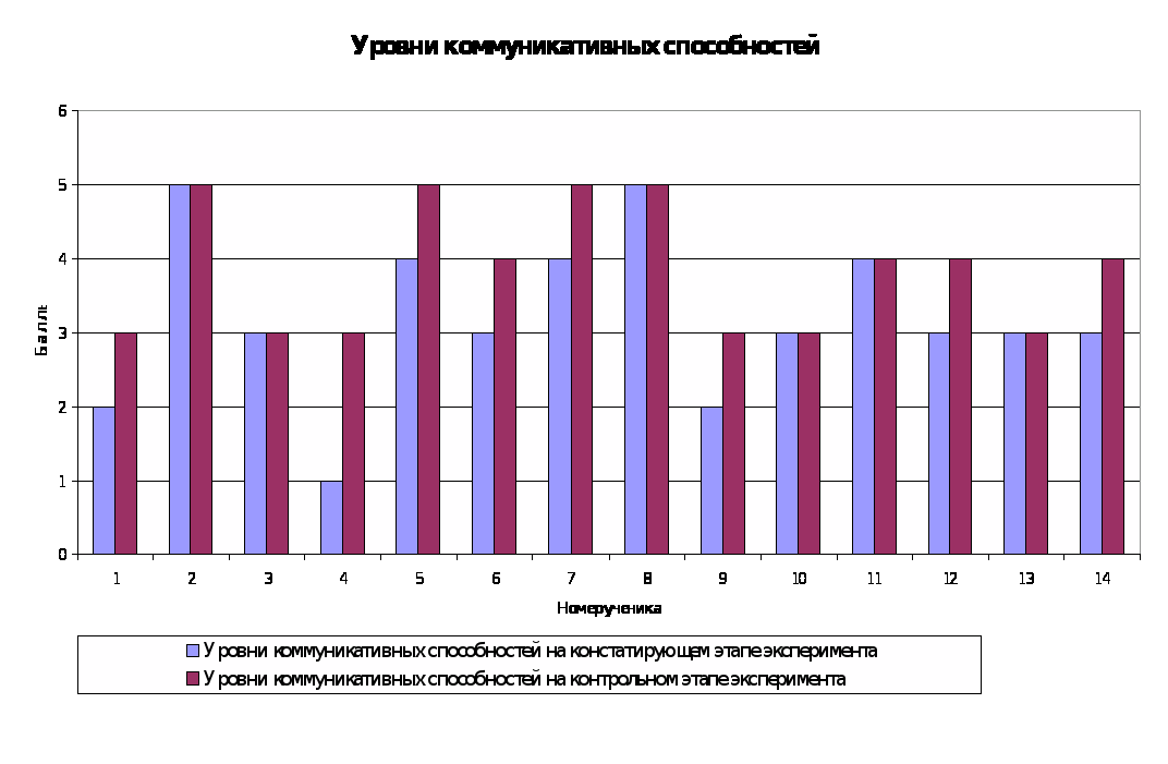 - выделяются три уровня коммуникативных способностей у подростков экспериментальной группы: средний (6 учеников), высокий (4 ученика), очень высокий (4 ученика). Ниже среднего и низкого уровня коммуникативных способностей нет.