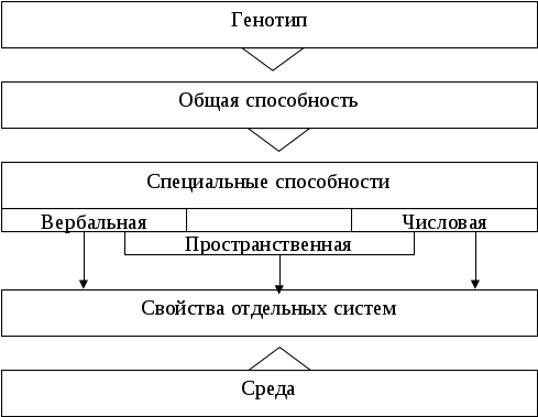 Вероятно, наиболее распространенным факторным описанием интеллекта является иерархическое[6;94]. Хороший пример его был предложен Верноном, полагающим, что интеллект может быть описан как способности различных уровней обобщения. На вершине иерархии находится общая (генеральная) способность, как ее определял Спирмен (модель интеллекта Спирмена рассмотрена подробно в §2). На втором уровне располагается основная группа факторов, например вербально-образовательная способность, необходимая для успеваемости по таким предметам, как английский или история, и практически-механическая способность, необходимая для успешного изучения ремесел и механики. На следующем уровне находится младшая группа факторов, выделенная из основной группы, а внизу помещаются специфические факторы, отмеченные Спирменом. Эта иерархия устраняет лакуны, существовавшие между двумя крайними видами факторов, предложенных Спирменом [12;137]. Между общим и специфическими факторами находится группа факторов промежуточных уровней общности.