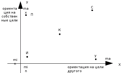 В целом можно выделить стратегии взаимодействия, исходя из особенностей мотивации, определяющей выбор стратегии. Представим себе взаимодействие как процесс, разворачивающийся в следующей системе координат. По оси У расположены стратегии взаимодействия, ориентированные на достижение участниками собственных целей. По оси Х - стратегии, ориентированные на достижение целей партнера по общению.