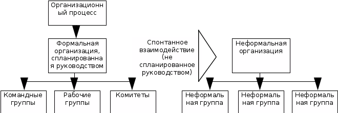 В неформальных организациях также имеются правила или нормы поведения, но неписаные. Они подкрепляются системой поощрений и санкций. Различие в том, что формальная организация, ее структура и тип строятся руководством сознательно по заранее продуманному плану. Неформальная же организация скорее является спонтанной реакцией на неудовлетворительные индивидуальные потребности, ее структура и тип возникают в результате социального взаимодействия.