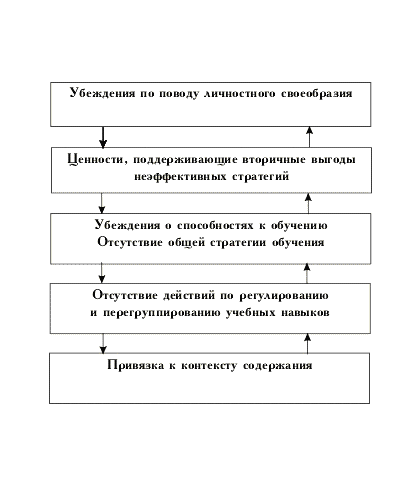К первой группе можно отнести перенос стратегий работы с новой информацией, которыми дети овладевают при переходе в среднее звено школы. "Читай медленно, иначе не поймешь!", "Вслух!", "Повтори!" - своеобразные когнитивные якоря при работе с любой информацией, видимой человеком в первый раз. Осознание того, что "новый" текст составлен из уже знакомых букв, слов, грамматических конструкций и логических блоков, остается оторванным от процесса чтения. Еще одно важное ограничение - недостаточно развитая способность к анализу собственно процесса обучения. Человек, не привыкший задавать себе вопрос: "Как я это делаю?", спонтанно вырабатывает у себя стратегию обучения, как правило, успешную только в определенном контексте, и механически переносит ее в другие, часто требующие противоположных навыков обучения, контексты. При недостаточной компетентности в каком-либо виде учебной деятельности происходит восполнение недостающих звеньев ментальной карты ученика соответствующими убеждениями. Одними из самых прочных являются ограничивающие убеждения, связанные с индивидуальной физиологией и генетическим своеобразием. "У нас в семье все читают медленно, а папа - доктор наук", или: "В детстве у меня было сотрясение мозга, с тех пор я плохо запоминаю". На основе этих убеждений формируются поддерживающие неэффективные когнитивные стратегии
