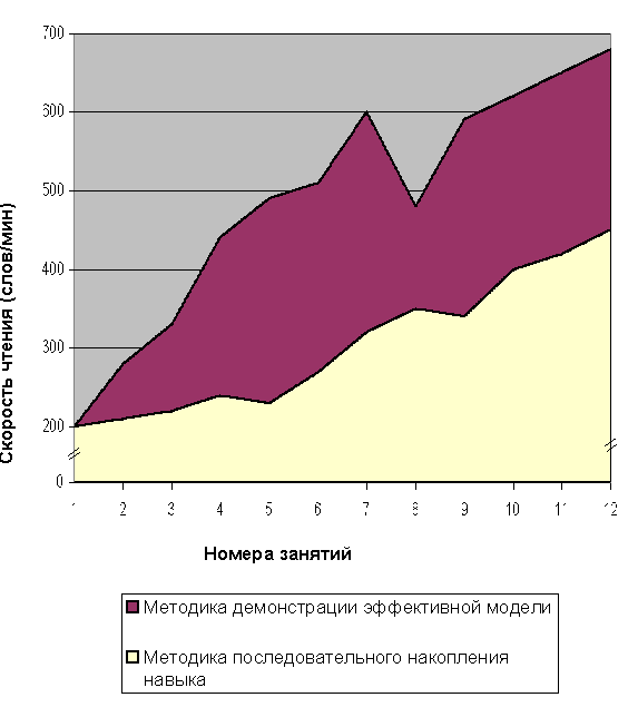 Когда я еще не была знакома с НЛП, в моей практике использовались самые различные последовательности формирования навыков динамического обучения. В своих первых группах я добросовестно и постепенно формировала у учеников некоторые физиологические навыки, затем переходила к их обобщению и к построению целостной модели восприятия. Мы подвигались медленно, НО верно J . Результаты были прочными, достаточно убедительными : и традиционными для подобных курсов. Сейчас мне стыдно просматривать графики динамики скорости чтения пятилетней давности. Вы их увидите несколько ниже - это хороший повод для размышления об успешных стратегиях преподавания любой дисциплины. По мере роста профессиональной компетентности я начала действовать более спонтанно и изменяла последовательность своих упражнений "по настроению" группы. Интуитивно я пришла к выводу, что предоставление успешной, "результирующей" модели работы с информацией на первых же занятиях дает мощный эффект. Язык описания и навыки НЛП дали мне возможность осознать свой опыт. Происходит не накопление навыков, а их скачкообразное "проявление". Автоматизм (неосознанное знание) не вырабатывается, а просто актуализируется. В нашем опыте уже есть все эффективные стратегии, но отсутствует механизм их поиска, востребования в соответствии с конкретной деятельностью. Интуитивное научение посредством моделирования - естественный и быстрый способ обучения. Последующий анализ того, чему мы научились и разукрупнение процесса обучения на составляющие стратегии, действия, состояния и их характеристики, вплоть до субмодальностей, позволяет выстроить максимально полную ментальную карту нашей когнитивной деятельности и дает нам мета стратегию динамического обучения. Результаты говорят сами за себя