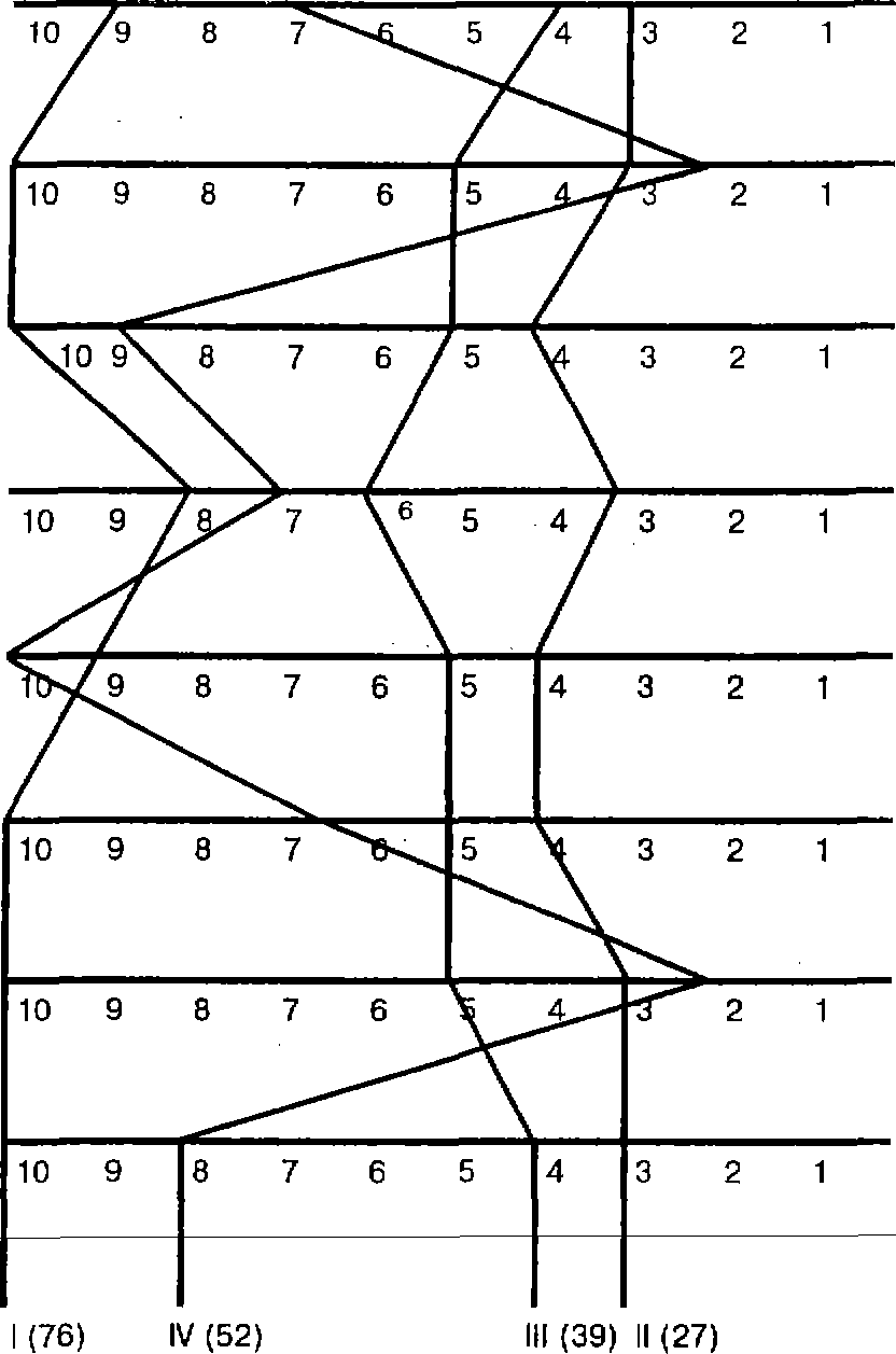 Обработка результатов: (при первичном обсчете показателей) производится путем суммирования цифр (баллон), отмеченных знаком «х» по всем шкалам. Чем больше баллов получает обследуемый в суммарной оценке, тем лучшим (позитивным) является его отношение и готовность к обучению. При вторичной обработке данных производится более тонкая, дифференцированная качественная оценка результатов. С этой целью цифры, отмеченные обследуемым знаком «х», соединяются последовательно от одной шкалы к другой отрезками прямой линии. Примеры такого соединения для четырех обследуемых представлены на приведенных на рис.1 шкалах и обозначены цифрами I, II, III, IV. Чем более спрямленной оказывается линия, соединяющая все восемь шкал, тем более выраженной является характеристика отношения и готовности обследуемого к профессиональному обучению: