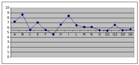 Результаты данного исследования выявили одного консультанта наименее активного и не направленного на личностный рост. Он эмоционально неустойчив, подвержен перемене чувств, легко утомляем, раздражителен. Ему свойственна застенчивость, неуверенность в своих силах, тревожность, ранимость, конформность. № 19 (5 курс МГОПУ) – имеет небольшой опыт работы на ТД (1 мес.), совмещая с работой в непсихологической службе.