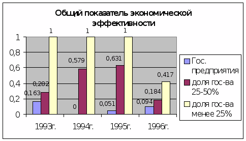 Общий показатель экономической эффективности составил в 1996г. на государственных предприятиях 0,094, на предприятиях группы А – 0,184, группы Б – 0,417. При этом, как видно из рис.5, преимущество приватизированных предприятий по показателям экономической эффективности наблюдалось в течение 1993-1996 гг.