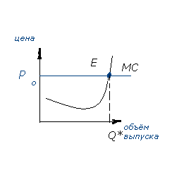 Это правило можно проиллюстрируем графически на рисунке 3. Ро – это цена, при которой фирма может продать любое количество продукции. Эта цена принимается совершенно конкурентной фирмой как данная. Кривая краткосрочных издержек обозначена МС. Предельные издержки растут при высоких объёмах выпуска вследствие закона убывающей отдачи. Оптимальный положительный объём выпуска достигается в точке Е, соответствующий выпуску Q*, в которой Ро=МС.
