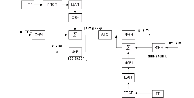 Речевой сигнал, поступающий на вход телефонной линии, обрабатывается ФНЧ. При этом ФНЧ осуществляет выделение стандартного речевого сигнала полосой 300…3400Гц. Отфильтрованный сигнал в сумматоре складывается с шумовой помехой, которую получают следующим образом: импульсы с тактового генератора подаются на вход генератора ПСП. Вырабатываемая генератором псевдослучайная последовательность преобразуется в шумовую помеху с помощью ЦАП. Затем ограничиваем полученную помеху с помощью ФВЧ, поскольку согласно условию технического задания нижняя граница спектра мощности помехи не менее 3500Гц. После того как отфильтрованный речевой сигнал складывается с внеполосной шумовой помехой, практически невозможно распознать речь при несанкционированном подключении к каналу связи на приемной стороне.